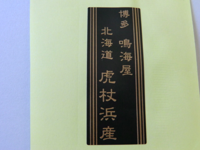 博多明太子で有名な「鳴海屋」さんの商品名ラベルです。 黒地のカッコ…